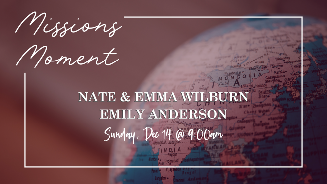 On December 14 at 9:00am, we will hear updates from both the Wilburns and Emily Anderson on their progress toward becoming missionaries through CCC. The Wilburns will be...